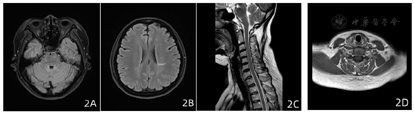入院体检:神志清,对答切题,双侧瞳孔等大等圆,直径3 mm,光反应灵敏,眼球活动自如,未及眼震,伸舌居中,双上肢、左下肢肌力5级,右下肢肌力3级,四肢肌张力正常、痛觉对称存在,四肢腱反射亢进,双侧踝阵挛阳性,双侧病理征(+),双侧指鼻试验及左侧跟膝胫试验完成稳准。颈软,Kernig征(-)。EDSS评分:2分。