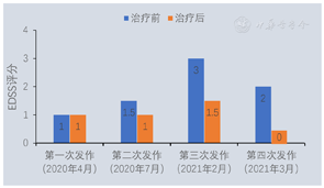 患者发作性右侧肢体无力,激素冲击治疗有效,症状不完全恢复,仍反复发作加重,自加用DMT药物西尼莫德,患者肢体无力症状基本完全缓解,自2021年4月出院后随访至2022年8月,16个月未再复发,末次复查颅脑、颈椎MRI(2021年9月)同2020年7月对比可见脱髓鞘病灶范围明显减小(图2)。现患者无不适主诉,双眼视力1.0,四肢肌力5级,双侧病理征(-),EDSS评分:0分,图3为患者治疗前后EDSS评分比较。