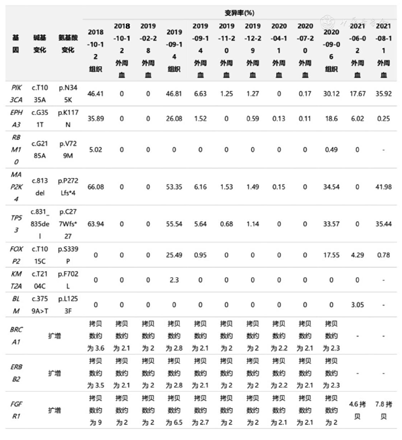 新辅助化疗疗效评估进展,更换方案后,疗效评估仍进展。手术后,病理报告提示为左侧乳腺癌(NST),腋窝淋巴结9/16转移(ypT2N2a,RCB Ⅲ级),组织学分级Ⅲ级8分,腔面B型。取原发灶组织行循环肿瘤DNA(ctDNA)检测,检出多种基因改变( PIK3CA p.N345K, EPHA3 p.K117N, RBM10 p.V729M, MAP2K4 p.P272 Lfs*4, TP53 p.C277Wfs*27, FGFR amplification 9copies, ERBB2 3.5 copies and BRCA1 3.6 copies),外周血检测FGFR、ERBB2和BRCA1拷贝数改变,变化趋势与组织相同,提示潜在转移可能。因此,行强化治疗,治疗后ctDNA检测结果同前。行内分泌治疗6个月余,病情进展,出现肝脏转移。肝脏组织病理特征与乳腺原发灶特征一致,肝脏转移灶及外周血ctDNA检测提示,基因突变特征与原发灶一致。行解救化疗,从一线治疗至后线治疗期间,数次ctDNA检测均显示,ctDNA改变早于影像学改变和血液学肿瘤指标改变。而且,在影像学检查难以判断疗效时,ctDNA检测帮助我们确认治疗方案。