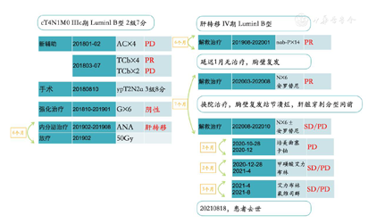 总之,这个病例是一个早期乳腺癌进展到晚期乳腺癌的典型病例。虽然,这不是一个成功治愈的病例,但是一个勇于探索的病例,通过循环肿瘤DNA的连续检测,我们验证了既往文献报道的结论,证实了连续ctDNA检测能够帮助判断转移灶的来源,治疗疗效和预后,而且,这种变化往往早于传统的影像学检查之前。这提示,在临床工作中,类似的病例,在知情同意后,我们可以采用连续ctDNA检测的方法更早更准确地判断病情变化,从而有的放矢针对性地治疗,使患者生存获益。