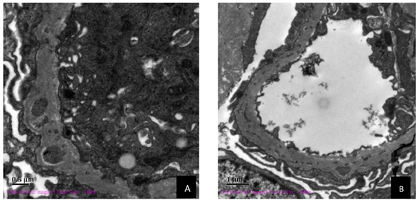 电镜描述:肾小球镜下可见2个肾小球,毛细血管内皮细胞明显空泡变性,个别管腔可见红细胞聚集,无明显内皮细胞增生,毛细血管袢开放。肾小囊壁层无明显增厚,壁层细胞空泡变性,无明显增生。基底膜不规则增厚,厚度达1300 nm。脏层上皮:上皮细胞肿胀,空泡变性,足突弥漫融合,基底膜内可见膜样结构。系膜区:系膜细胞和基质增生,未见电子致密物沉积。肾小管-间质:肾小管上皮细胞空泡变性,肾间质无特殊病变。肾间质血管:个别毛细血管管腔内可见红细胞聚集,小动脉未见病变(图1)。