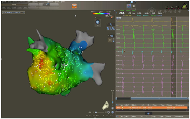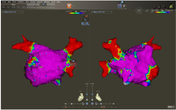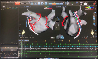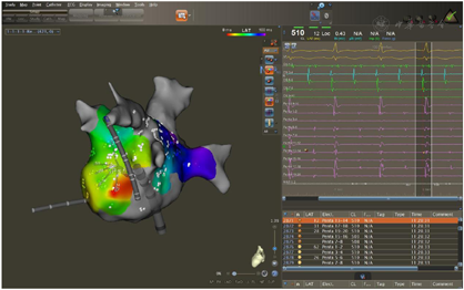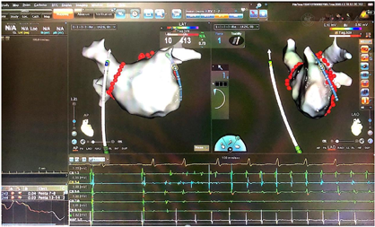 :入院后考虑诊断"阵发性房颤",有再次射频消融指征,术中标测左房及肺静脉电压提示双肺静脉电位恢复,再次进行双肺静脉隔离至肺静脉电位消失后仍有房速、房颤反复短阵发作。结合术前心脏彩超、冠状窦电极走行及激动标测结果考虑永存左上腔静脉起源房速、房颤,行永存左上腔静脉内消融后房颤、房速终止。
