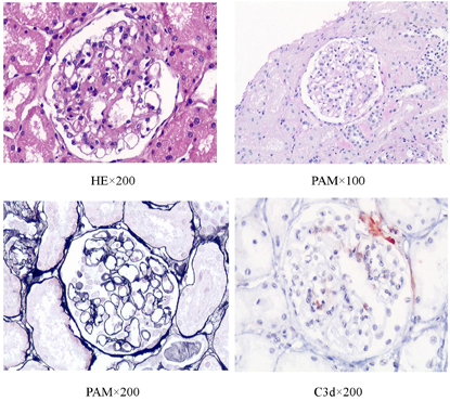 入院后完善三大常规、肝肾功能、血脂、凝血四项、尿相差+镜检、尿微量白蛋白/肌酐比值、24 h尿蛋白定量,骨穿+骨髓活检、心电图、心脏彩超、泌尿系彩超、胸部CT等检查,最终诊断由肾穿刺活检术后病理确诊。