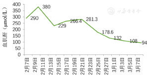 1.(2022年2月7日)血生化:尿素21.0 mmol/L↑、肌酐290.0 μmol/L↑、尿酸493.2 μmol/L↑、白蛋白37.7 g/L↓、肌酸磷酸激酶579.8 U/L↑、乳酸脱氢酶315.8 U/L↑、胆固醇5.27 mmol/L↑、低密度脂蛋白3.20 mmol/L↑;(2022年2月10日)血生化:尿素26.6 mmol/L↑、肌酐380.0 μmol/L↑、尿酸556.6 μmol/L↑、白蛋白28.0 g/L↓;(2022年3月8日)生化:肌酐94.0 μmol/L,尿酸121.9 μmol/L↓白蛋白25.7 g/L↓。