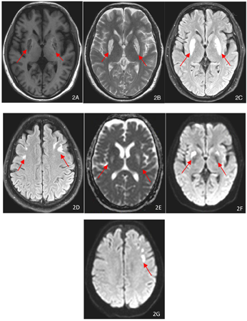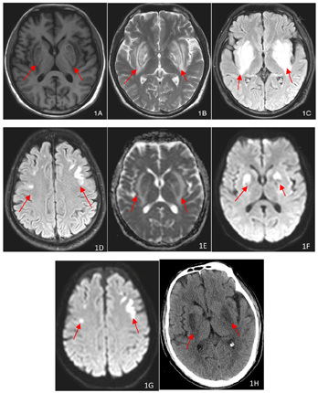 患者18 d前无诱因出现步态不稳,随后出现全身抽搐、两眼上翻,伴意识不清,在外院经"气管插管机械通气、血液透析、抗癫痫、抗感染"等治疗,症状好转,但仍意识模糊遂转入本院,住院期间患者出现帕金森样震颤加重、吞咽困难、肌力下降、重度低钠血症、多尿。入院体格检查:嗜睡,叫醒后反应迟钝,言语不能,构音障碍,四肢肌力3级,肌张力偏低,双侧巴氏征阳性。