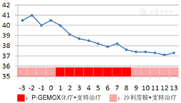 2017年11月23日开始予以P-GEMOX方案联合沙利度胺化疗,并碱化、水化、补充白蛋白、输注血浆等支持治疗。