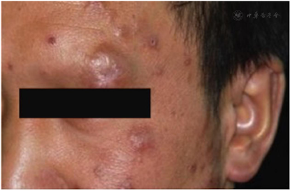 面部结节样皮疹,舌面干燥,口腔内可见数枚义齿,双下肢少许紫癜,双下肢轻度浮肿。