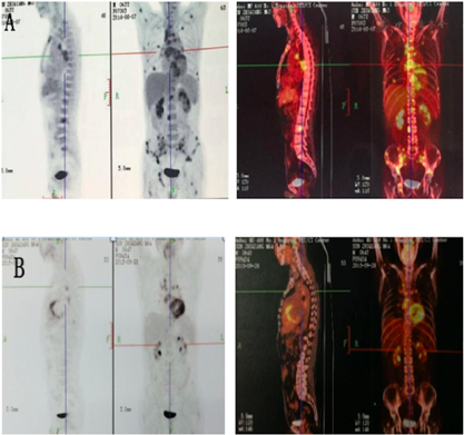 患者胸闷气喘及咳嗽、心悸、乏力纳差症状明显好转,皮疹减轻,心力衰竭症状好转,肾功能恢复,血常规及炎症指标较前好转,影像学检查肿大淋巴结明显缩小或消失。