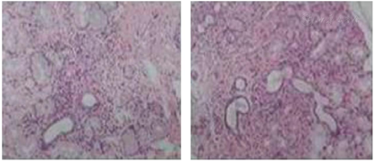 辅助检查:角膜荧光染色:睑裂部角膜大量着色块及着色点,泪膜破碎时间:2 s,眼科检查结论:干眼症。唇腺活检病理(图4);唇腺小叶中央区导管周多灶性淋巴、浆细胞浸润;每灶内淋巴细胞大于≥50个/4 mm2,少量腺泡萎缩。