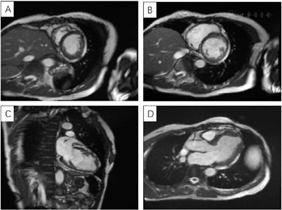 CMR近年来越来越被认可,其诊断标准包括[5]:(1)直接征象:①心室壁分为2层,较薄的致密化层以及较厚的存在网状肌小梁和隐窝的非致密化层。在MRI上,舒张末期非致密化层/致密化层比例≥2.3,或者舒张未期测量左心室肌小梁质量≥总质量20%;②常见的受累部位为心尖部及左心室中段游离壁,基底段及室间隔较少受累;(2)间接征象:①左心室腔不同程度增大,继发二尖瓣功能异常和左心功能不全,可有左心房增大;②左心功能减低,受累节段室壁运动减弱。③小梁间隐窝会导致血流瘀滞,血栓形成;④微循环受损,非致密化心肌有时会出现不同程度纤维化,延迟增强上表现为不同程度强化。对存在NYHA Ⅲ/ Ⅳ级、心房颤动、室性心动过速、心室颤动、心脏明显增大等高危因素的患者,早期行心脏移植或植入ICD可降低死亡风险。