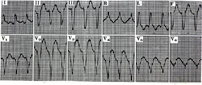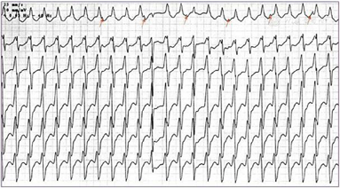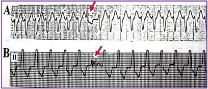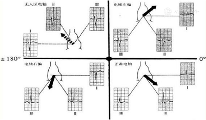 本例患者病程中以宽QRS心动过速为主要表现,是指QRS波宽度>120 ms的心动过速,可见于心房颤动伴预激、室上性心动过速伴差传、室性心动过速、起搏心律。其中,室性心动过速心电图的鉴别要点主要包括以下几点:(1)房室分离(图6);(2)室性融合波;(3)窦性夺获(图7);(4)无人区电轴(图8);(5)QRS波同向性(图9);(6)QRS波时限(>150 ms)。室性心动过速除见于缺血性心肌病外,还多见于扩张性心肌病早期、心肌致密化不全、致心律失常性右室心肌病、心肌炎后遗症等。一般情况下,需要植入ICD预防心脏猝死。