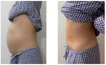 患者,女性,37岁,因"两次开腹子宫肌瘤剔除术后18年,腹胀、憋气4个月"就诊。18年前因腹胀就诊,发现子宫肌瘤,在外院行开腹子宫肌瘤剔除术,术中剔除两个肌瘤直径分别为5 cm和3 cm,病理报告子宫平滑肌瘤。13年前因尿频就诊,发现子宫肌瘤复发,在外院再次行开腹子宫肌瘤剔除术,术中剔除多个肌瘤,直径2~6 cm,术后病理子宫平滑肌瘤。10年前因不孕就诊,发现子宫肌瘤第二次复发。考虑两次手术后均出现复发,且为良性疾病,故不愿再次手术。第二次术后未出现泌尿、消化及生殖等系统的症状,亦未定期复查。4个月前开始腹胀、憋气,并有加重趋势,近几天食欲减退,有时出现尿频,故在当地医院就诊,彩超提示盆腹腔巨大肿物,转来我院。自觉睡眠及排便尚可。手术前后腹部对比图见图1。