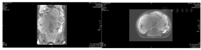 影像学提示巨大实性肿物充满盆腹腔,呈混合密度,表面见血管。纵膈受压,部分肺膨胀不全,腹腔脏器被推挤向外移位,下腔静脉远端回流受阻,子宫、膀胱及直肠明显受压。穿刺活检病理报告子宫平滑肌瘤。
