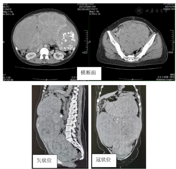 自觉明显腹胀、气短。腹部膨隆,触及腹盆腔巨大实性肿物,上至剑突,下到盆底,活动差。