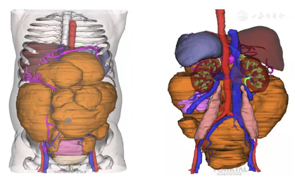经过多学科团队的讨论,考虑巨大肿物对身体多个器官的压迫,造成多器官功能不良,以及切除该实性肿物手术时风险极大,子宫平滑肌瘤对GnRHa有一定敏感性,因此希望通过注射GnRHa使肿瘤一定程度缩小,减少肿瘤对受压器官的影响,降低手术的难度和风险。然而经过3个月治疗(即注射三次GnRHa)后复查发现:肿瘤没有缩小,患者的营养状态却越来越差。多学科团队第二次讨论:考虑患者保守治疗效果不好,因此需要积极手术。对术中可能出现的意外情况作了充分的准备工作:向患者及家属进行充分的知情告知,术前放置双侧D-J管,血管造影判断肿物的主要血供来源,三维重建对肿物与腹盆腔主要器官的解剖关系进行预判,静脉营养改善患者状态,备多科室协同手术(麻醉科、普外科、泌尿外科、血管外科、心内科、ICU)。