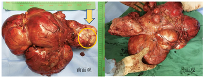 术中取腹部正中纵切口,上至剑突,下到耻骨联合,缓慢进腹,逐步释放腹腔压力,见腹盆腔巨大肿物质硬,表面光,与子宫后壁相连,呈分叶状将肠管等腹盆腔脏器挤向周围,肿物完全充满腹盆腔,下极将盆底向下挤压,并与盆壁相邻,上缘达剑突上2 cm,与大网膜、壁腹膜、后腹膜、肠壁多处粘连,其中与乙状结肠、升结肠、直肠形成大面积致密粘连,子宫前方与膀胱后壁大面积致密粘连,右侧附件完全被分叶之肌瘤包裹其中,无法暴露。左侧输卵管增粗膨大,与左侧卵巢、乙状结肠、左侧壁腹膜大面积粘连,与周围粘连带将左侧卵巢包绕其中,子宫常大,探查横膈、肝、胆、胃、肠、大网膜、腹膜及淋巴结未见异常。术中间断性抬起肿物分离其与周围组织间粘连,同时防止腹压释放过快导致循环系统衰竭。