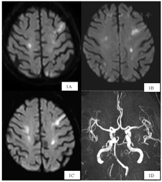 复查头MRI+MRA:双侧额顶叶、右侧侧脑室额角可见多发斑点及斑块状弥散受限,诊断脑内多发急性脑梗死灶;MRA示:双侧胚胎型大脑后动脉、基底动脉近端局限性狭窄;右侧椎动脉V4段移行为小脑后下动脉。(图1)。