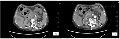超声心动图:双房增大(左房48 mm,右房46 mm×55 mm),射血分数60%,主动脉瓣、二尖瓣、三尖瓣少量反流,轻度肺动脉高压;颈动脉超声:双侧颈动脉斑块形成,右侧椎动脉起始段狭窄(狭窄率50%~69%);下肢动脉超声:双下肢动脉斑块形成、左侧胫后动脉闭塞、左侧腓动脉近闭塞;下肢静脉超声:左侧胫后静脉血栓形成;腹部超声:肝脏实性占位性质待定;脾大;胆囊壁增厚;右肾囊肿。腹部CT:肝S6段占位性病变;考虑恶性病变;胆囊结石;慢胆囊炎;慢性胰腺炎伴假性囊肿形成;双肾囊肿(图2)。