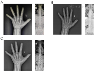 所有患儿血尿常规、肝肾功能、甲状腺和肾上腺皮质功能均正常。3例患儿均予生长激素(growth hormone,GH)激发试验,其中2例患儿GH部分缺乏(GH峰值<10 ng/mL);促性腺激素释放激素(Gonadotropin releasing hormone,GnRH)兴奋试验提示3例黄体生成素(Luteinizing hormone,LH)峰值>5 IU/L,染色体正常。上腹部和妇科彩超未见异常,骨龄提前,脊柱X线片提示3例患儿脊柱无明显异常,垂体MRI未见异常。3例患儿主要临床资料见表1。