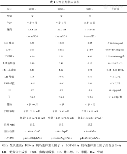 3例患儿均表现为严重身材矮小,8岁前出现双侧乳房发育,GnRH激发试验提示下丘脑-垂体-性腺轴功能启动,骨龄提前,但患儿没有出现线性生长加速,考虑合并其他因素,故行全外显子检测,结果提示3例患儿均存在ACAN基因杂合致病性变异。结合临床表现及基因检测结果,"矮小症(ACAN基因变异)、中枢性性早熟(central precocious puberty,CPP)"诊断明确。