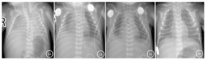 因"早产复苏后23 min"入院,反应差,超早产儿貌,呼吸浅促,65次/min,气管插管T组合正压给氧下(氧浓度100%)经皮血氧饱和度91%。