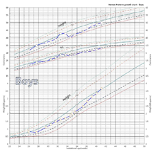 出院时患儿矫正胎龄41周,体重3670 g(位于P41),身长50 cm(位于P18),头围33.3 cm(位于P6)。矫正1.9月龄时,体重4500 g(位于P25),身长57.2 cm(位于P75),头围37 cm(位于P25)。生长发育随访显示患儿身长、头围追赶良好,体重稍落后(图2)。矫正2月龄时神经系统随访:运用儿童神经心理行为检查量表(2016版)显示矫正年龄发育商达同龄水平(大运动128,精细运动110,适应能力110,语言73,社会行为92,警示行为0)。头部核磁共振检查:双侧脑室欠对称,左侧脑室稍扩张,脑部成熟髓鞘形成水平相当于修正2月。脑电图、视觉诱发电位、听觉脑干诱发电位未见异常。此患儿矫正年龄不足1岁,目前仍在密切随访过程中。