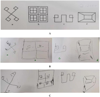 MMSE:20(扣分项:定向力8、回忆1、言语1);LOTCA 92分(扣分主要项目:定向力10、思维操作13);MoCA 13(扣分项:视空间与执行功能4、延时回忆5、句子复述1、语言相似性2、定向5);临床记忆检查记录表:MQ=33(很差<69)(指向记忆、联想学习、图像自由回忆、无意义图形再认、人像特点回忆均很差);RBMT行为记忆检查6分:重度障碍;数字广度测验正常;视觉图形记忆检查提示患者存在图形记忆障碍(图1)。Barthel指数:15(得分项:大便5、小便5、转移5)。