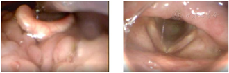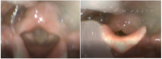吞咽器官功能评估:面部肌肉力量弱,缩唇及撅嘴幅度小;吞咽反射功能评估:呕吐反射减弱,咳嗽反射减弱,咳嗽力量弱,吞咽反射延迟;喉功能评估:喉上抬幅度小,咳嗽声音小;感觉评估:右侧面部针刺觉稍减弱;右侧口腔内温度觉稍减弱。VFSS吞咽造影:食物进入气道,进入声带以下,无用力清除表现。患者存在构音障碍及吞咽障碍(图2、图3)。