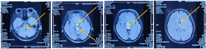 病生理方面,本患者存在认知记忆障碍、平衡协调障碍和吞咽构音障碍。此外还有眼震和眼肌麻痹。记忆障碍可能与间脑结构(丘脑、下丘脑和乳头体)受损有关,与内侧颞叶损伤引起的记忆障碍类似。眼部异常症状与中脑和脑桥的外展神经核和眼球运动中心受损相关,躯干四肢的共济失调及吞咽构音相关肌肉的运动失调可能与小脑蚓部受损有关[10]。