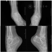关节活动度(range of motion,ROM)评定(以中立位0°法表示),AROM,左踝:内翻10°-外翻0°,0-背伸5°-跖屈60°;右踝:内翻15°-外翻0°,0-背伸45°-跖屈75°;PROM,左踝:内翻20°-外翻10°,背伸5°-0-跖屈70°;右踝:内翻15°-0-外翻10°,0-背伸35°-跖屈75°;肌力:肱二头肌、肱三头肌、髂腰肌、臀大肌、臀中肌、髋关节内收肌、股四头肌、腹直肌均为4级;协调及平衡:双侧轮替试验、指鼻试验、跟膝胫试验欠稳准,坐位平衡2级,不能独站。右侧踝关节肿胀疼痛,负重下VAS评分10分。