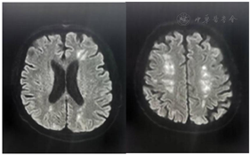 患者出现意识障碍,意识状态界于醒状昏迷至微小意识状态之间,四肢无肌力和肌张力,复查头颅MRI提示双侧脑梗死灶明显增多,后死于肺部感染。