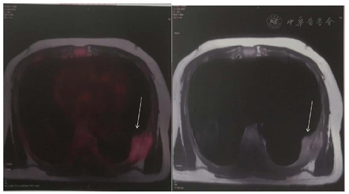 血常规:Hb 98 g/L,WBC 8.22×109/L,PLT 143×109/L,CRP 2.83 mg/L。生化:血钙2.68 mmol/L,肌酐134 μmol/L,总蛋白69.8 g/L,白蛋白52.6 g/L,球蛋白17.2 g/L,白球蛋白比:3.1,LDH 275 U/L,铁蛋白896 ng/ml,pro-BNP 983 pg/ml。胃镜:慢性非萎缩性胃炎伴胆汁反流。肠镜:直肠息肉(类圆形,直径约3 mm),已取活检,1周后拿病理报告。PET/MR(图1):左侧第7肋骨质断裂,胸壁直径4.8 cm类圆形软组织团块影,SUVmax 2.98。
