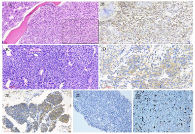 骨髓荧光原位杂交技术(fluorescence in situ hybridization:FISH)IgH重排阳性,RB1基因缺失18%,D13S319基因缺失26%,1q21/1p32融合基因异常11%。直肠息肉病理:极少量活检组织,浆细胞瘤不能除外,CD38+CD138+,ki-67:30%。胸壁肿物病理(图2C~G):浆细胞骨髓瘤,CD38+,kappa+,ki-67为20%,刚果红染色阴性,MYD88阴性。