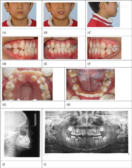 面部正面观,左右对称,面上中下1/3比例尚可。侧面观,凹面型,上颌后缩,下唇稍前突。正面微笑上切牙暴露不足。口内检查:替牙列晚期,上颌双侧第二乳磨牙以及左下第二乳磨牙未脱落,右下第二前磨牙萌出中,替牙间隙存在。磨牙中性关系,前牙浅反覆合,左侧后牙反合。上牙列严重拥挤,双侧侧切牙腭向错位无间隙,下牙列中度拥挤(图1)。患者轻微张口,下颌未能后退达到切对切咬合。