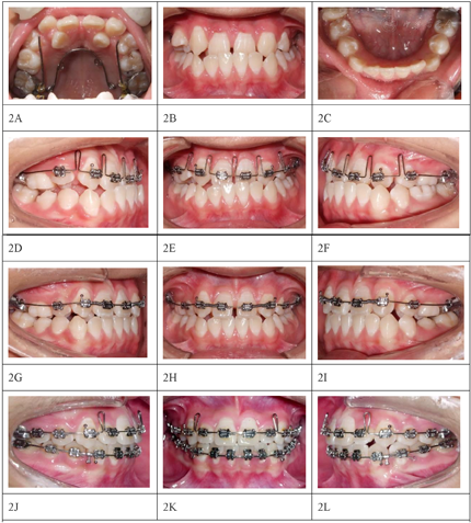 解除后,继续采用0.018英寸不锈钢丝配合推簧,利用替牙间隙获得上颌侧切牙排齐空间。上颌侧切牙排齐及维持前牙覆合覆盖后,采用0.016×0.022英寸不锈钢丝弯制关闭曲关闭牙弓中剩余间隙(图2)。下颌逐步更换钢丝排齐,采用0.019英寸×0.025英寸不锈钢丝作为稳定弓丝。颌间牵引精细调整牙位以及稳定咬合。2010年1月拆除固定矫治器,佩戴哈利氏活动保持器。