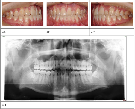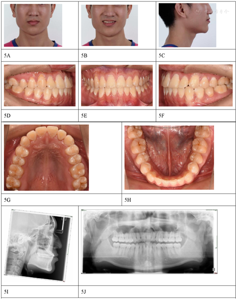 关系,上下牙列轻中度拥挤,磨牙关系为中性,右侧尖牙关系偏近中。全景片显示下颌第三磨牙阻生(图4)。2014年8月粘结全口直丝弓固定矫治器,上下颌前牙区配合邻面去釉获得间隙,逐步更换弓丝,上下颌采用0.019英寸×0.025英寸不锈钢丝作为稳定弓丝,配合颌间短Ⅲ类牵引维持前牙覆合覆盖及调整尖牙磨牙关系,保持3个月后拆除固定矫治器(图5),佩戴透明保持器。二次矫治治疗时长25个月(首次矫治结束后55个月),患者在二次治疗中已经拔除阻生的第三磨牙,侧切牙反