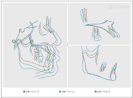 首次治疗前、治疗后、二次治疗后头影测量数据以及轮廓重叠图(表1,图6)。