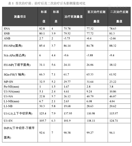 的纠正。而二次治疗后的头影测量显示,与首次治疗后相比,ANB角减少了2.3︒,而下颌平面角减少了8︒(下颌平面逆时针旋转),说明患者继续其水平生长型。正畸治疗后反