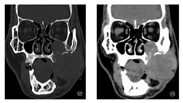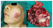 专科检查:双侧颜面部不对称,左侧面颊部明显膨隆,左面颊部可见一大小约2.0 cm×2.5 cm圆形破溃肿物,表面皮肤破溃,伴脓液流出,周围皮肤组织红肿,质地硬,边界不清(图1)。左眼闭合全,左鼻唇沟变浅,左口角向下歪斜,不能完全闭合,鼓气左口角漏气。开口度约1指半,开口型右偏。口内见:左颊部可见皮瓣存在,皮瓣上缘前庭沟处可见一菜花伴溃烂肿物,大小约3.0 cm×4.0 cm,上界累及左侧上颌骨牙龈及部分硬腭组织,下界至皮瓣上份,前界距口角1.0 cm,后界至翼下颌韧带,左侧上下颌牙列缺损,口腔卫生差(图1)。左侧颏唇沟处、颌下及颈部可见原手术瘢痕。颏下及双侧颌下、颈部未触及明显肿大淋巴结。