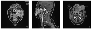 磁共振口腔及颈部平扫增强(图2):左颊部可见一长T1长T2信号肿块灶,增强后呈轻中度部均匀强化,较大层面大小约51 mm×52 mm,肿块向上突入左侧上颌窦,与邻近上颌骨及上牙槽分界不清,左眼眶外侧壁呈长T1长T2信号,增强后可见强化,向内与舌体分界不清,向外与左侧咬肌分界不清,左侧翼外肌T2WI信号稍增高,双侧颈部多发小淋巴结。