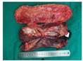 手术情况(包括肿瘤切除、颈清及皮瓣制取):于2020年8月30日在全麻下行:颊颌颈联合根治术+左部分眶内容物摘除术+右股前外侧游离皮瓣修复术(皮瓣大小28 cm×11 cm)+气管切开术。手术切除范围包括:左眼球及其周围附丽组织,部分眶骨,上颌骨,颧骨,部分颧弓,半侧下颌骨,原手术移植的皮瓣,腮腺,部分鼻甲,部分上下唇组织。
