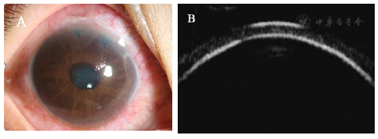 患者,女性,45岁。既往体健。本次因"右眼抗青术后3个月,眼痛伴视物模糊1 d"于我院青光眼专科就诊。患者3个月前因"双眼原发性急性闭角型青光眼"于当地医院依次行"右眼激光虹膜周切术"和"双眼小梁切除术"。1 d前患者突觉右眼眼痛伴视物模糊,遂急诊至我院门诊就诊。