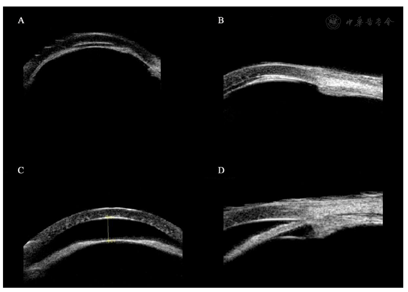 术后3 h,患者右眼眼压降低至32.2 mmHg,前房开始加深(图2A),睫状突前旋转(图2B)。术后第6天,眼压降低至10.3 mmHg,前房深度为1.50 mm,睫状体后旋转(图2C、图2D),予以停用阿托品眼用凝胶及降眼压药物。术后3个月,患者右眼眼压为16.9 mmHg,术后8个月,右眼眼压为16.1 mmHg。在此期间,患者未再使用阿托品眼用凝胶等睫状肌麻痹剂及任何降眼压药物,未见并发症,右眼前房深度逐步加深(术后8个月为1.82 mm),裸眼视力提高到0.3,并保持稳定。