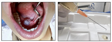 专科检查:面型对称,双侧髁突活动度一致,张口度可,双侧头颈部未扪及明显肿大的淋巴结。口腔卫生一般,右口底可见一大小约为1.5 cm×2.0 cm的半透明状肿物,浅蓝色,质软,界清,无压痛,不活动,有波动感(图1A),穿刺抽出蛋清样黏液(图1B)。