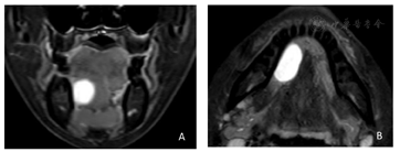影像学检查:颌面部MRI平扫示右口底椭圆形异常信号,边界清楚,信号均匀,范围约为2.3 cm×1.1 cm,T1W1低信号,T2W1高信号。DWI未见弥散受限,舌下腺囊肿可能(图2)。