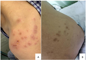 该病例病程初期曾疑诊嗜中性皮病,但当时未完全明确其背后是否存在着感染、肿瘤、免疫等因素参与,虽经激素及免疫抑制剂治疗,但效果欠佳,造成病程迁延,病情反复。由于感染诱因未去除,患者又存在自身炎症性疾病基因突变基础,造成炎症状态持续,反复发作皮疹及骨髓炎症,甚至发生病理性骨折,并继发一系列免疫反应(小血管炎、嗜酸性粒细胞增多),进而导致严重血栓/栓塞事件。在患者明确NTM感染后,予积极、规范、长程抗NTM治疗,并予中小剂量激素控制患者炎症及免疫反应,患者目前感染及免疫炎症状态得以很好的控制。因此,如患者疑诊或确诊嗜中性皮病,应注意其隐藏的原发病因的筛查,如患者合并浅表淋巴结肿大,除需警惕肿瘤外,亦需警惕特殊病原体感染。