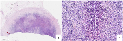 患者,男性,66岁,主因"反复发热、皮疹伴淋巴结肿大3年"于2021年3月16日入院。2018年患者无诱因出现低热,并逐渐出现全身皮疹(双手→头面→四肢→躯干),高于皮面,表面脓疱伴破溃、结痂。同时伴发左颈部、双侧腋下、腹股沟区多发淋巴结肿大。曾行皮肤活检病理提示表皮基底层下方水疱形成,真皮大量中性粒细胞及核尘,部分血管管壁纤维素样变性。考虑Sweet综合征或坏疽性脓皮病可能,曾予激素、雷公藤治疗效果不佳,后自行停药。行左颈部淋巴结活检病理提示小型上皮样肉芽肿形成,可见闭塞性血管炎;抗酸、PAS、GMS(-);未见淋巴瘤及IgG4相关性疾病证据。此后患者每1~2个月左右再发全身散在小脓疱疹,伴发热及浅表淋巴结多发肿大,期间监测血嗜酸性粒细胞逐渐升高(0.3×109/L→1.2×109/L);行骨穿及骨活检未见明显异常。患者2年前在无明显应力外伤情况下出现右股骨干病理性骨折,术后病理:增生成熟度不一的小梁骨,小梁骨间为疏松纤维血管肉芽样组织增生,散在炎细胞浸润,间质纤维性肉芽组织增生,炎性增生或修复性改变为非特异性。2020年11月患者突发左眼视网膜动脉阻塞,虽经药物治疗后仍存在视力障碍。患者于2021年1月2日、2021年2月20日突发急性脑梗死2次,2021年3月16日在双联抗板基础上再发急性脑梗死;2021年3月22日发生急性非ST段抬高型心肌梗死。患者无慢性基础疾病。个人史方面,患者2017年中旬至发病前有间断泡温泉,曾患肺炎1次;养龟10年余,末次接触为3年前(皮疹发生后仍有短暂接触)。