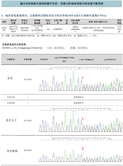 患者临床表现复杂,常规相关化验检查未有明确阳性提示。遂拟针对患者淋巴结、皮肤及骨骼病变进一步行组织活检。1.左滑车上淋巴结切除活检病理:淋巴结结构破坏,被膜纤维增厚、胶原化;结内多个上皮样肉芽肿结节,中央脓肿及坏死,周边多核巨细胞反应,伴小淋巴细胞及浆细胞、嗜酸性粒细胞浸润,小血管增生;IHC:CD3++,CD20+,CD138,IgG+,IgG4散在+,CD68(KP1)++;EBER-;抗酸-,GMS-,PAS-;综上,符合淋巴结化脓性肉芽肿性炎(图2)。淋巴结组织TB/NTM-PCR:偶发分枝杆菌(ct值36-38);淋巴结组织NGS:偶发分枝杆菌,序列数1;淋巴结组织培养:在培养至第11天,检验科回报偶发分枝杆菌阳性。2.右上臂皮疹皮肤活检病理:表皮上层嗜中性细胞脓疡,真皮全层弥漫嗜中细胞浸润,伴少许嗜酸性粒细胞,未见血管炎改变;病理符合嗜中性皮病;抗酸染色(-)。皮肤组织TB/NTM-PCR及皮肤组织NGS亦均提示偶发分枝杆菌阳性。3.左股骨穿刺活检病理:急性炎性纤维素性渗出物及少许破碎死骨组织;骨髓培养(-)。此外,因患者发病具有周期特点,亦完善全外显子测序以评估是否存在自身炎症性疾病。全外显子基因测序结果提示患者存在PSTPIP1杂合变异,患者儿子及患者姐姐均存在此杂合变异(图3)。