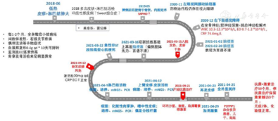 患者播散性偶发分枝杆菌感染(皮肤、淋巴结)诊断明确,根据药敏结果及非结核分枝杆菌病诊断与治疗指南(2020年版)推荐[1],予亚胺培南、米诺环素、环丙沙星三联抗感染治疗。因患者长期感染炎症持续状态,继发嗜中性皮病及小血管炎等免疫反应,进而出现嗜酸性粒细胞增多及血栓栓塞事件。住院期间监测患者皮疹仍有反复、伴嗜酸性粒细胞及炎症指标升高,再发腔隙性脑梗死事件,推测全身免疫炎症反应仍未完全控制,遂加用泼尼松15 mg/d口服,并逐步规律减量。出院后患者规律抗NTM治疗×8个月,密切随访患者10月余,患者泼尼松减量至2.5 mg/d,未再出现发热及新发血栓/栓塞事件,皮疹已转为陈旧(图1B),复查浅表淋巴结超声提示原颈部、锁骨上、腋窝、腹股沟肿大淋巴结较前消失,滑车上淋巴结较前明显缩小(具体),炎症指标及嗜酸性粒细胞计数正常(患者病情演变及诊治过程见图4)。