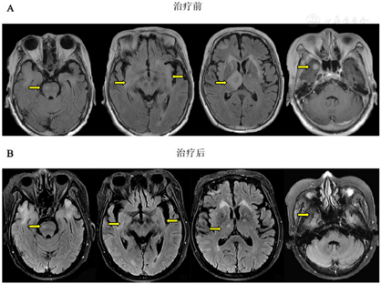 经过2个月的强的松治疗,嗜睡症状明显缓解,认知功能改善。复查头颅MRI示丘脑病变较前明显好转,复查胸部CT示双肺门、纵隔内多发肿大淋巴结及双肺结节均较前缩小。